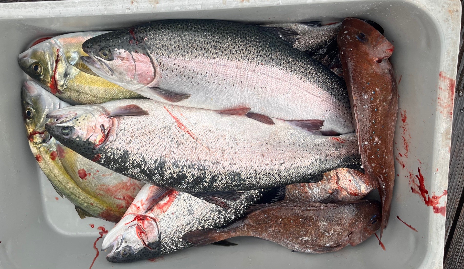 ☆只今の放流魚 →タイ・ジャンボブリ・ハマチ・ブリ・レモンサーモン