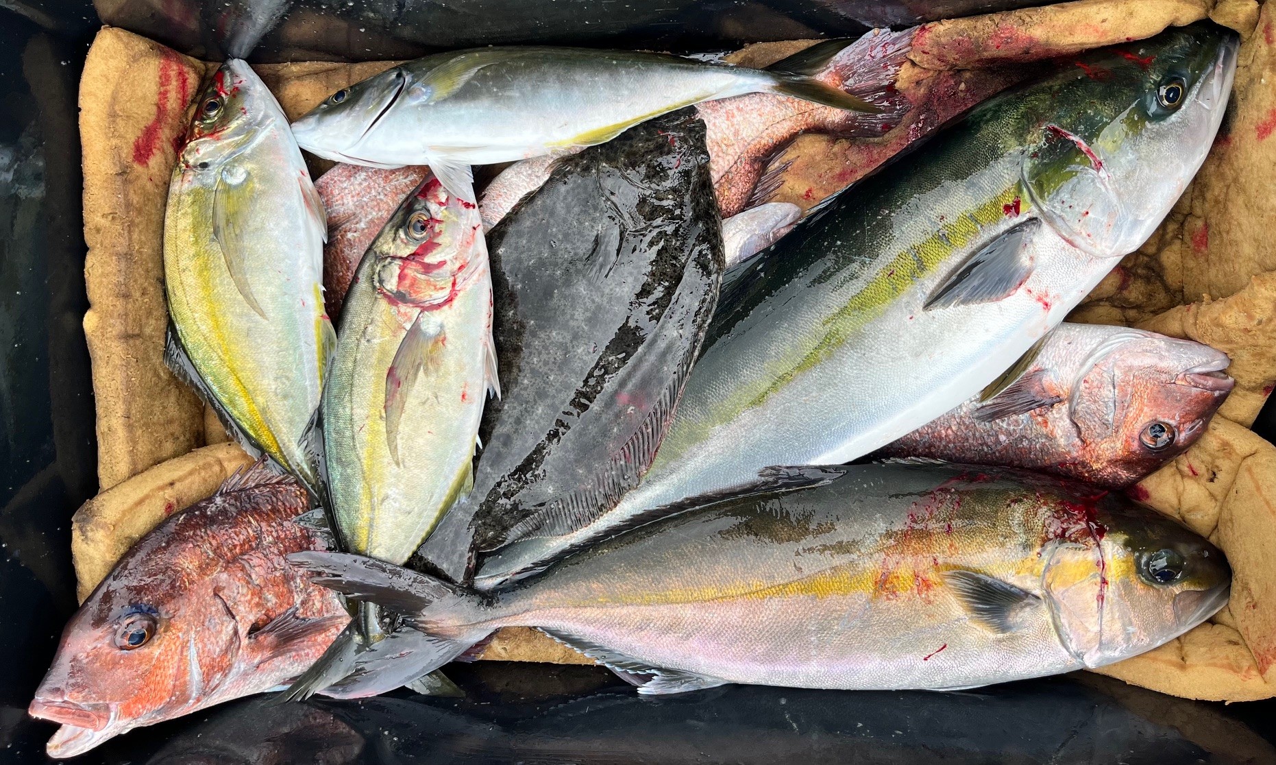 只今の放流魚→タイ・ジャンボブリ・レモンハマチ・ハマチ・ブリ・ヒラマサ・シマアジ