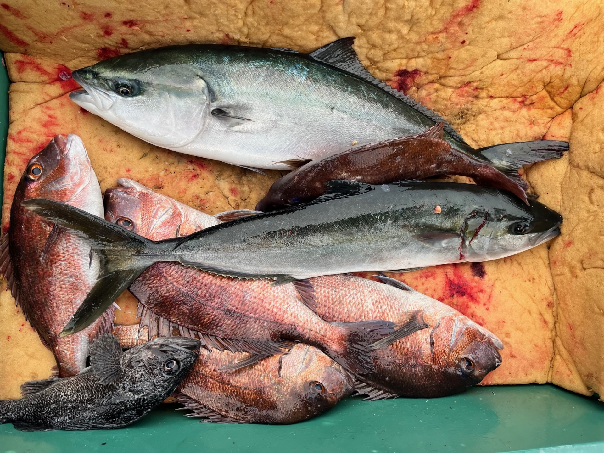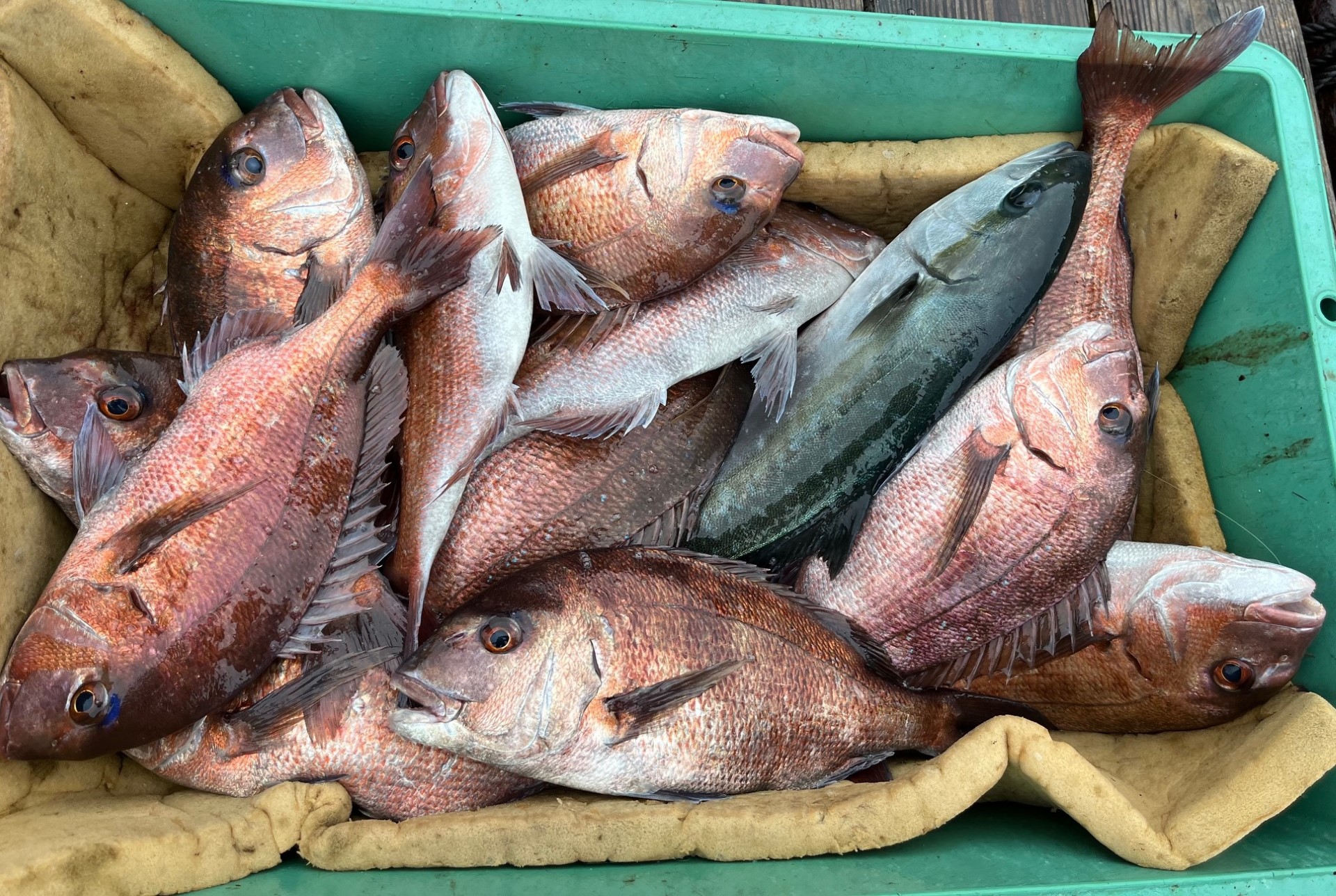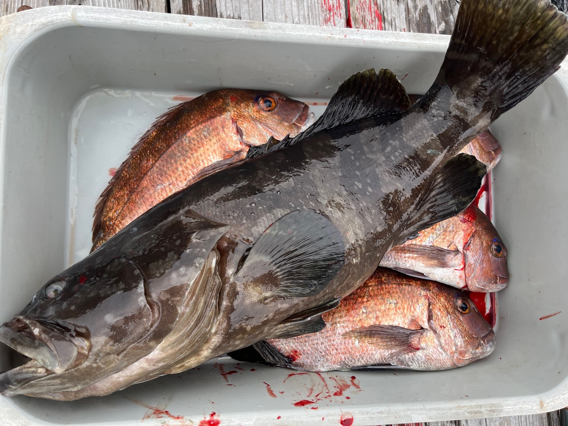 ☆今日は青物のアタリが良かったです。タイは釣り座によって差が出た感じでしたがモエビ・練り餌でよく釣れてました。クエはイワシで釣れました!!