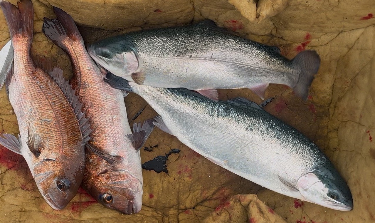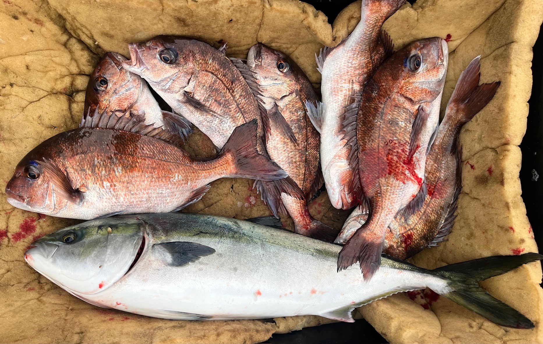 青物は生き餌、タイは練り餌・ブドウ虫・ササミ・エビに食いついてました。